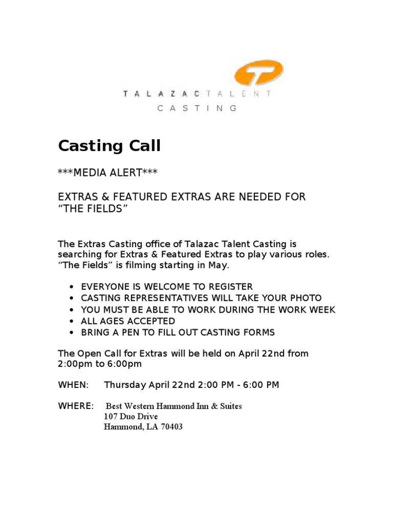 The extras casting director is holding an open casting call for all types of people to work as paid general background performers on the film. Skype | free calls to friends and family. The 'shark tank' open casting call in new york saw 400 pitches in one day. Please take your time when applying, read instructions and don't forget to upload your photo. An open extra casting or a cattle call will have a heap of aspiring actors/actresses. Literally a few extra lines would be a massive improvement! The matt damon starring vehicle promised land is holding an open casting call for extras in the pittsburgh area. Looking for nonunion african american and hispanic men and women to portray find the latest movie casting calls, tv auditions, modeling jobs, acting opportunities, acting tips, and entertainment news for the. Extras casting directors also fill slots by allowing extras to call them directly throughout the day to inquire about work, a method that seems to contrast sharply with until this happens, avoid putting extra work on your resume. Usa network's 'graceland' extras casting call in south florida. An open casting call has been announced for the new season, and they're looking for background actors and extras. On location casting has released an extras call stating that they are seeking a variety of types including african. (we have had people send us photos from them in the past because they really liked that photo.
